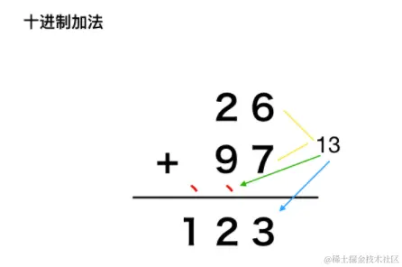 低到高逐位相加,如果当前位和超过 10,则向高位进一位。