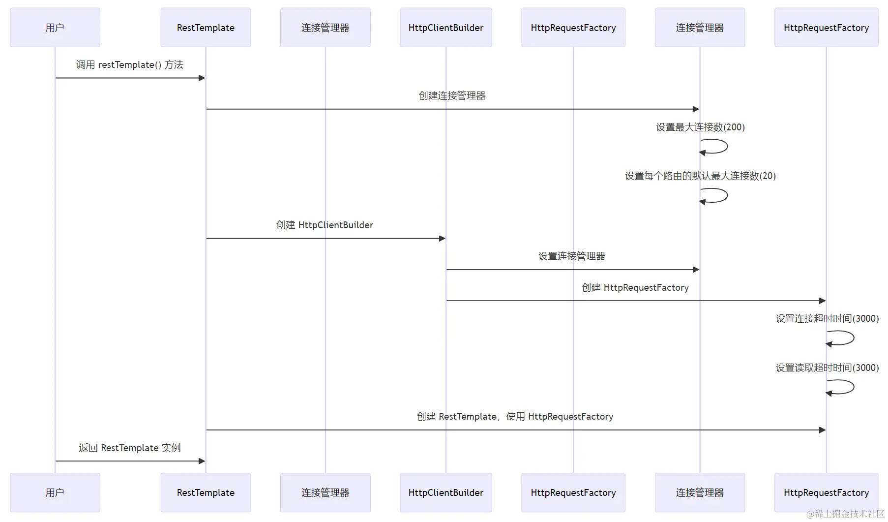 HttpClient来使用连接池。import org.apache.http.impl.client.CloseableHttpClient; import org.apache.http.impl.client.HttpClients; import org.apache.http.impl.conn.PoolingHttpClientConnectionManager; import org.springframework.http.client.HttpComponentsClientHttpRequestFactory; import org.springframework.web.client.RestTemplate; public RestTemplate createRestTemplate() { PoolingHttpClientConnectionManager connectionManager = new PoolingHttpClientConnectionManager(); connectionManager.setMaxTotal(200); // 设置最大连接数 connectionManager.setDefaultMaxPerRoute(20); // 设置每个路由的默认最大连接数 CloseableHttpClient httpClient = HttpClients.custom() .setConnectionManager(connectionManager) .build(); return new RestTemplate(new HttpComponentsClientHttpRequestFactory(httpClient)); }
