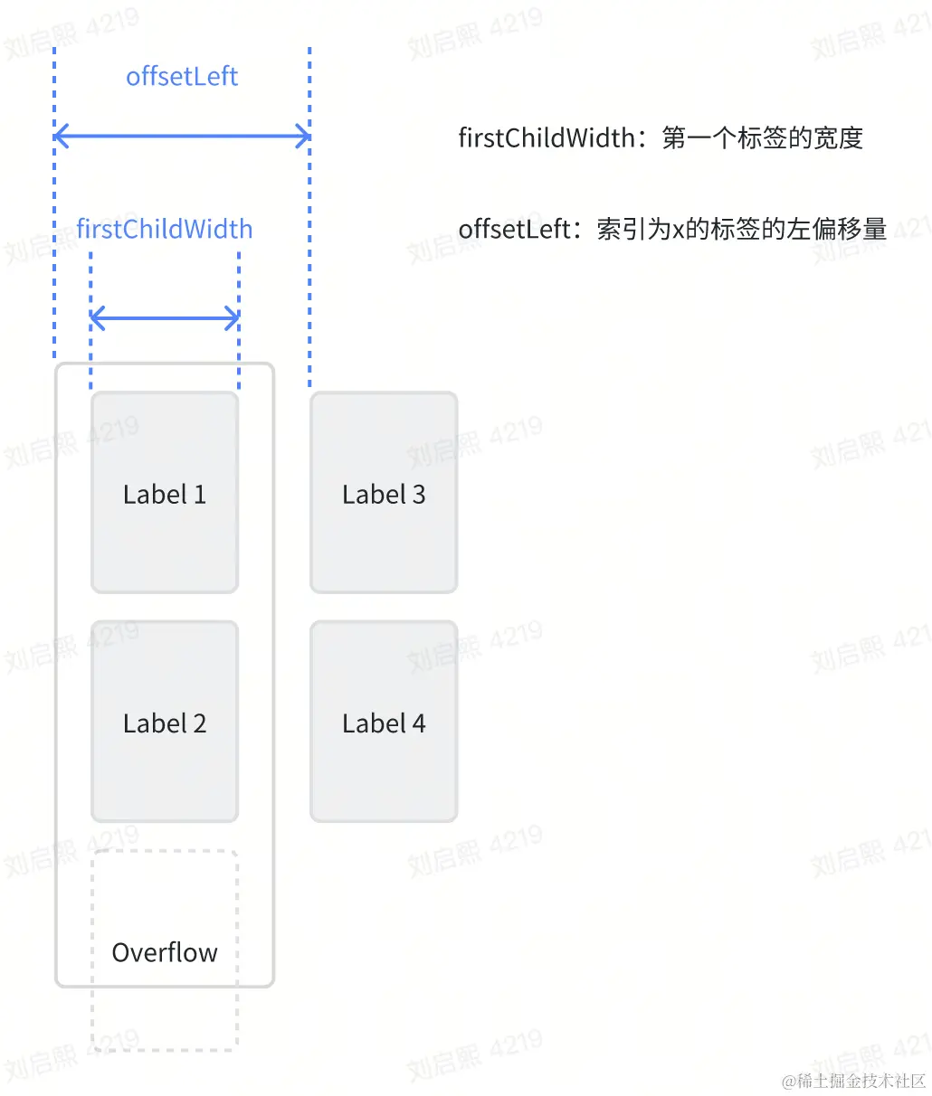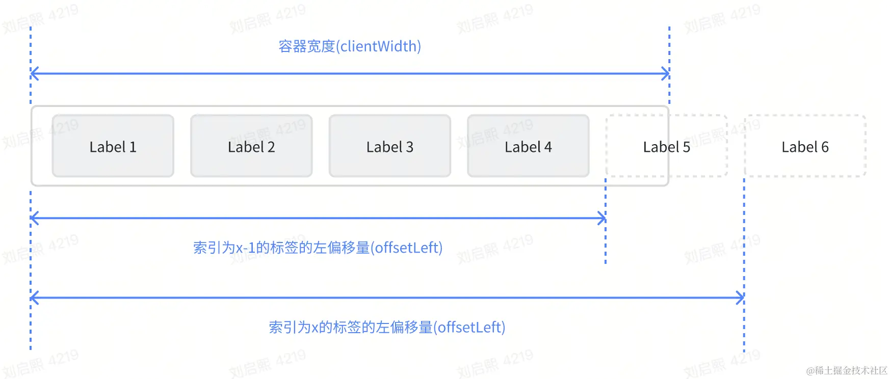 - 在渲染第一个标签的同时,渲染一个不可见的容器(以下简称hidden-list),设置其内部为弹性布局:主轴为水平方向、起点在左侧