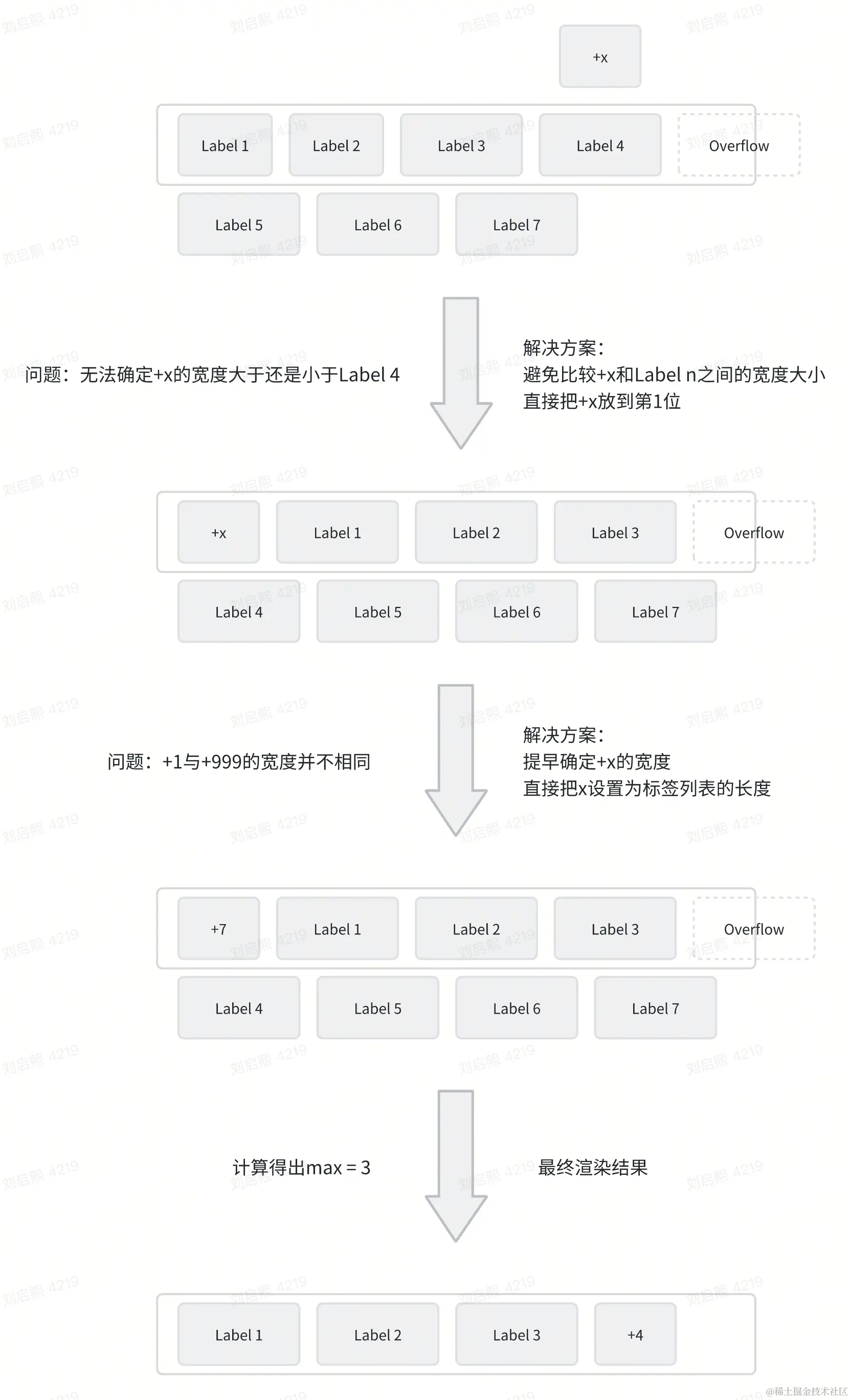 解决方案:避免比较+x和Label n之间的宽度大小,直接把这个特殊标签放到hidden-list的第1位进行渲染。