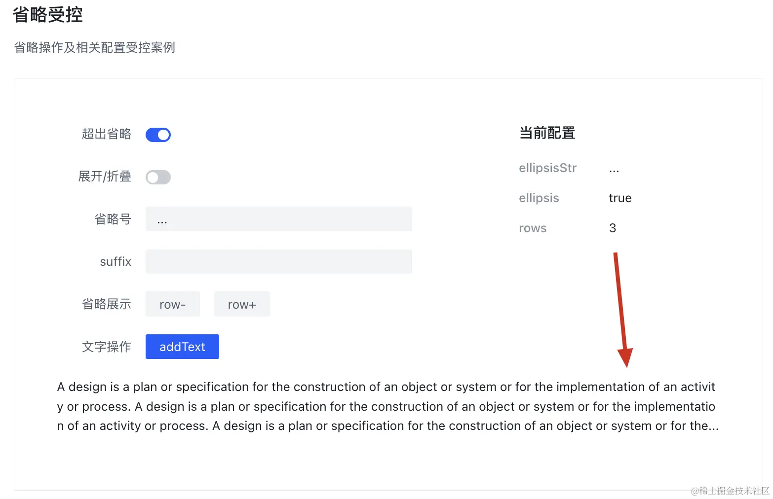 在文本溢出省略的场景中,默认都是在“超出 1 行”时进行省略,但在 arco-design 的 Typography 组件中,我们还可以通过rows来配置超出多少行进行省略: