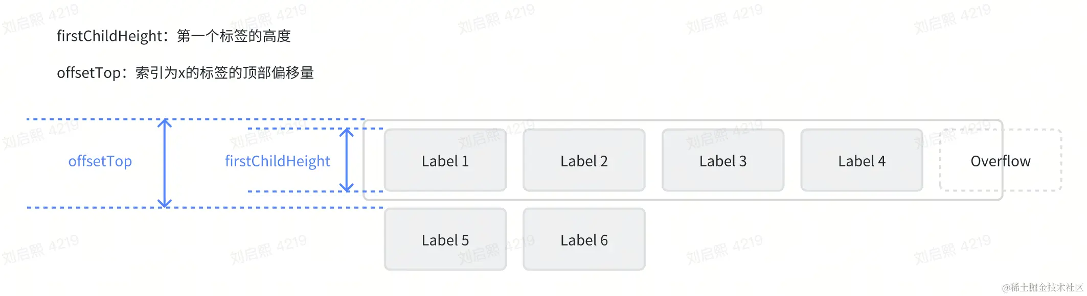 通过渲染一个不可见的标签列表hidden-list,提前确定每个标签的位置,再通过比较标签和容器的相对位置来计算可见标签的数量。
