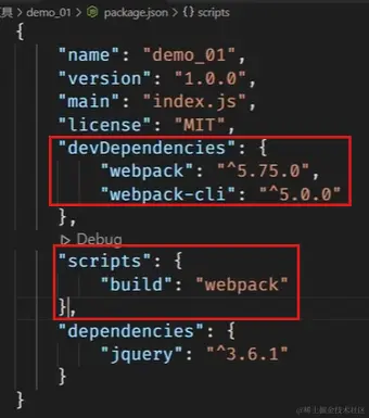 npm add -D webpack webpack-cil-D:表示我安装的是一个开发依赖(devDependencies) ,webpack 并非项目运行刚需,而是只在项目开发阶段有用。
