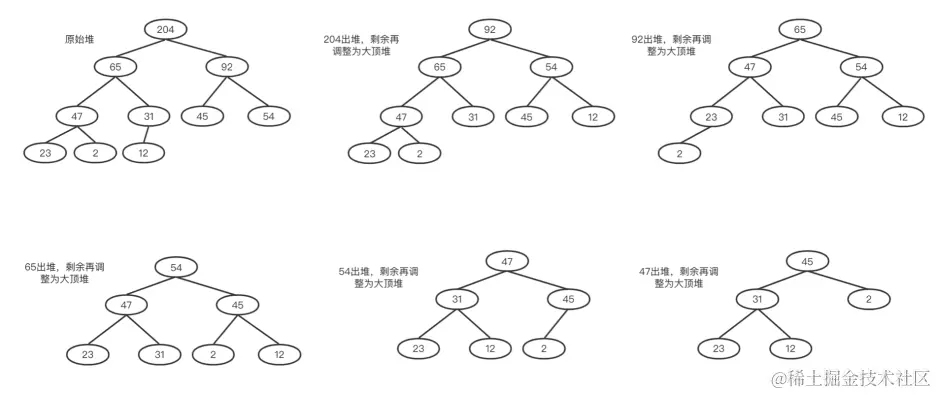 看一个例子,我们对上面第一章的序列 [12 23 54 2 65 45 92 47 204 31]进行排序,首先构建一个大顶堆,然后每次我们都让根元素出堆,剩下的继续调整为大顶堆:
