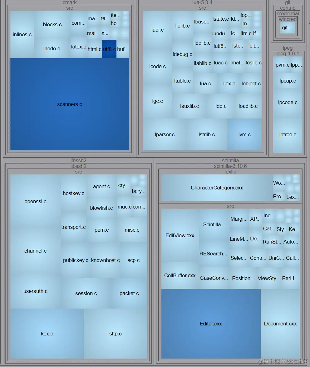 度量树状图中的每个块都代表代码中的一个文件、类或函数。图块的大小和颜色渐变各不相同,以区分度量指标的程度。