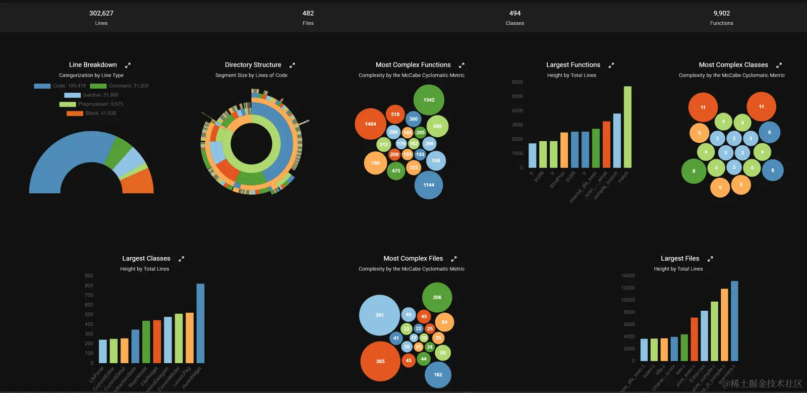 度量图表可提供整个项目的信息,包括最复杂和最大的函数、类和文件等。