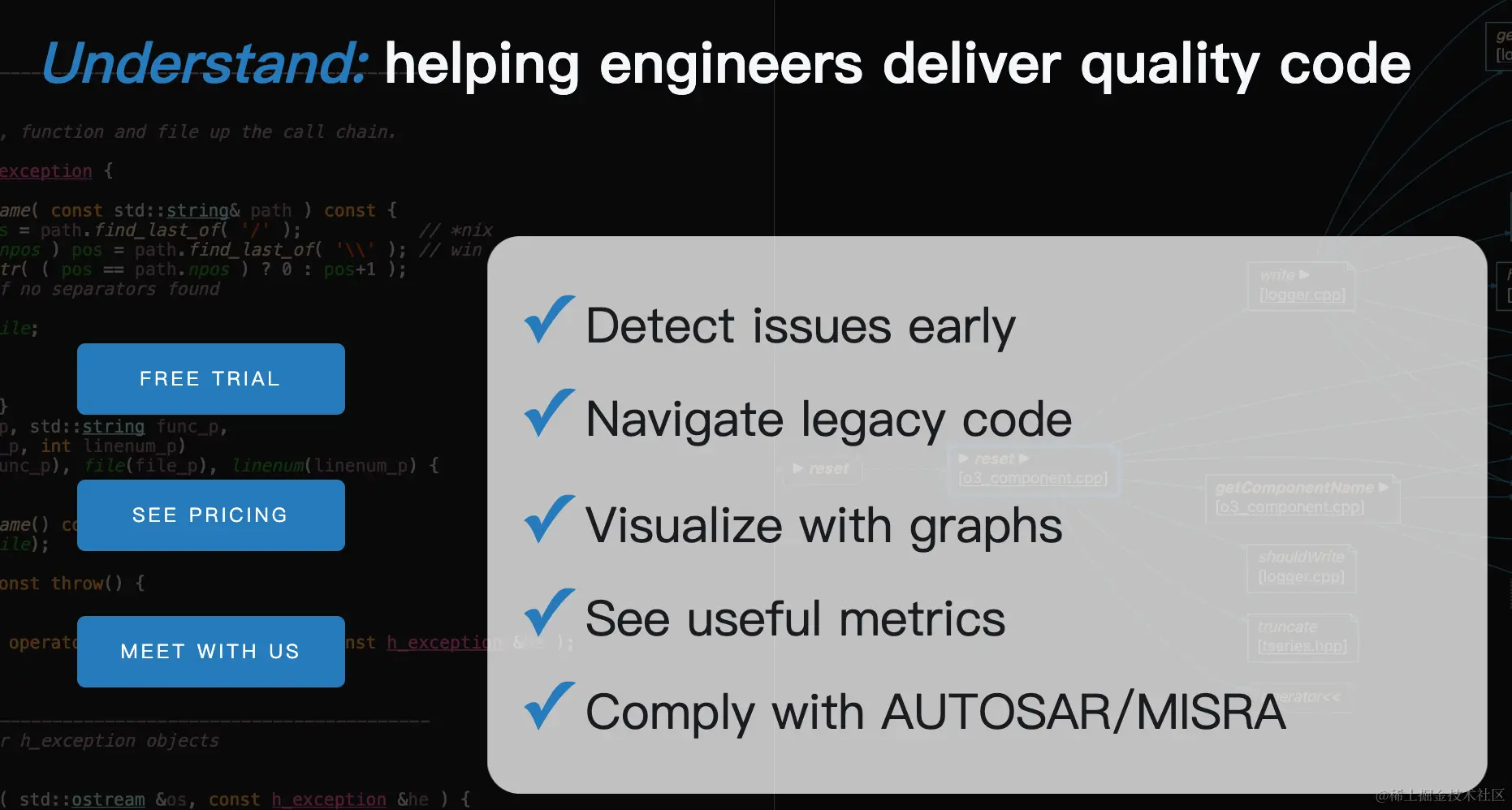 Understand使用静态代码分析技术,提供了多个维度的代码分析结果展示,其核心功能和SI类似但更丰富,而且工具易用性更好,也支持多种操作系统。