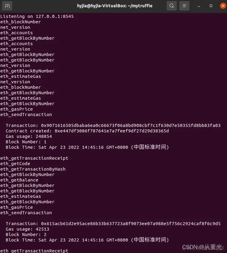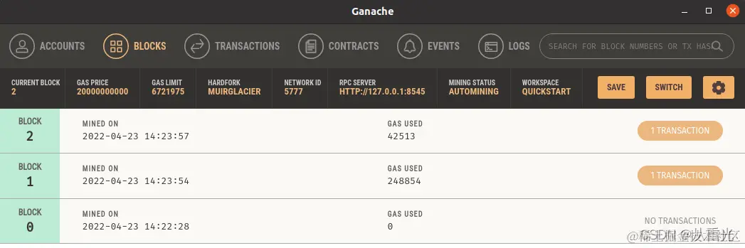从界面ganache界面看结果,可以看到ganache中多了几个区块