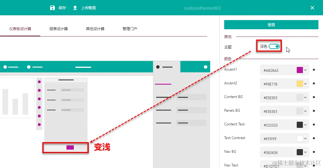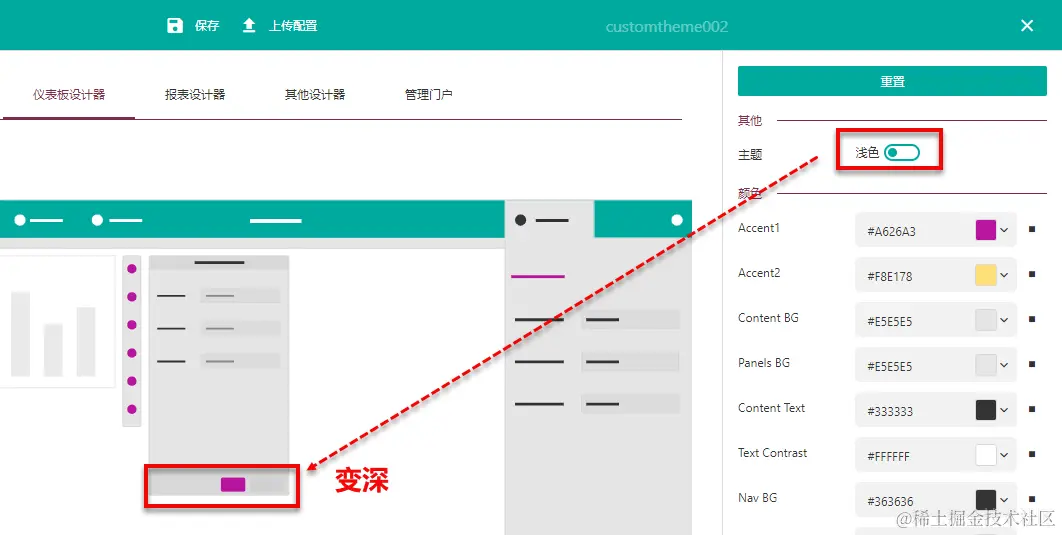 第三步设计系统配色,可以直接输入颜色值的代码,也可以单击色块选择颜色,单击上方的菜单可以切换至不同的设计器或门户,查看效果。