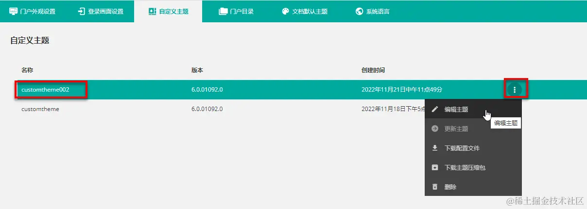 第五步创建完成后可在主题列表中看到自定义主题,并且可以管理主题。如编辑,更新主题,下载配置文件,下载主题压缩包,删除等。