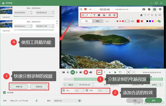 步骤4:录制过程中,您可以使用软件自带的工具箱来对内容进行放大、添加箭头等操作。录制结束后,还可以对视频进行剪辑。