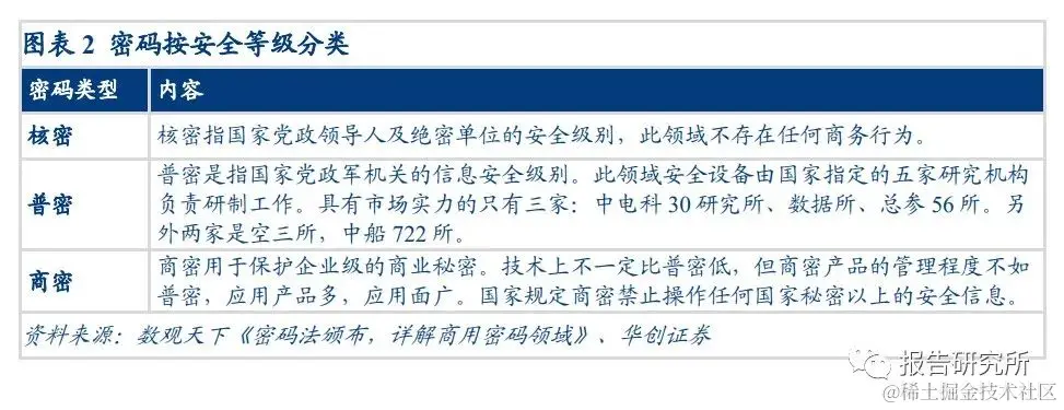 为了保障国家信息安全、自主可控,我国制定了自己的密码法律、法规,及配套的密码算法。《中华人民共和国密码法》中将密码划分为核心密码、普通密码和商用密码。