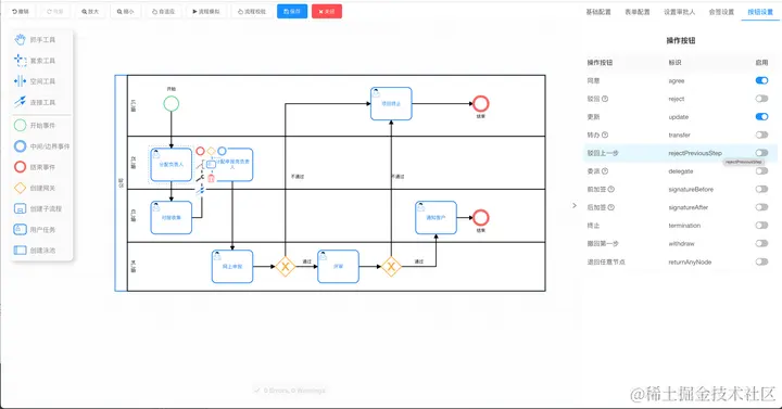 内置审批按钮有:同意、驳回、更新、转办、驳回上一步、委派、前加签、后加签、终止、撤回第一步、退回任意节点。如需要其它业务按钮,可自定义扩展。
