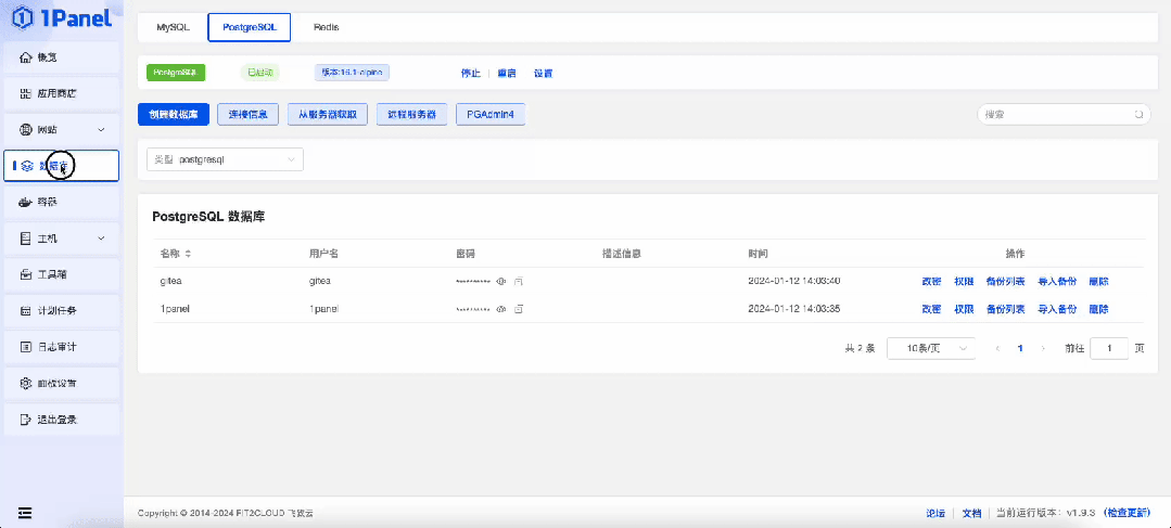 1Panel v1.9.3版本引入了全新的PostgreSQL数据库管理功能,为用户提供更为强大的数据库管理体验。现在,用户可以直接在1Panel操作界面上执行各种PostgreSQL数据库操作,从而实现更加高效的数据管理和维护。