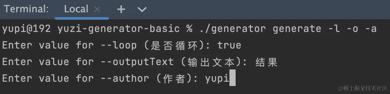 这里鱼皮推荐一个最佳实践:建议给所有需要交互式输入的选项都增加 arity 参数(一般是 arity = "0..1"),这样用户既可以在完整命令中直接给选项填充参数,也可以选择交互式输入。