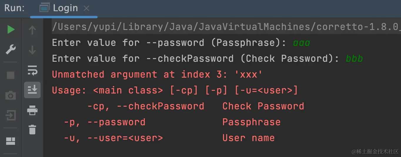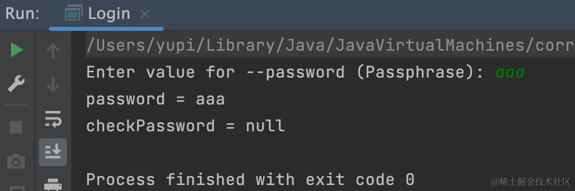 执行结果如图,不再提示让用户输入 password 选项,而是直接读取了命令中的值: