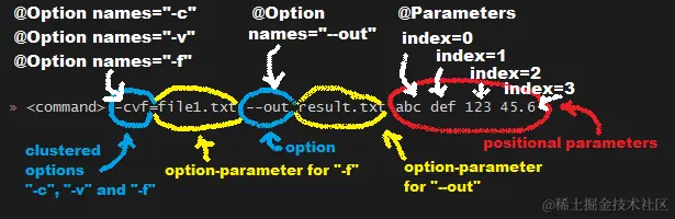 @Option注解用于解析选项@Parameters注解用于解析参数