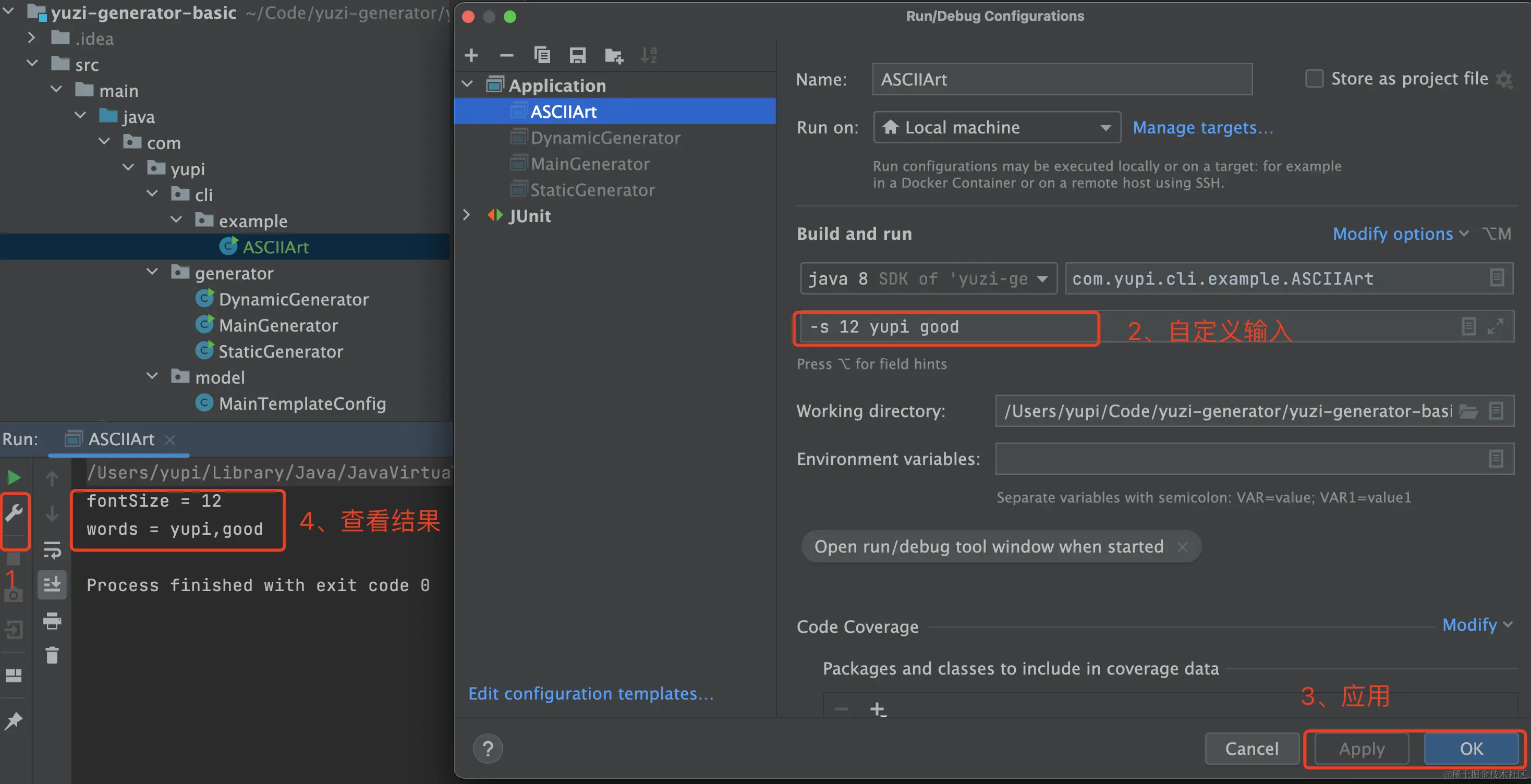 2)复制官方快速入门教程中的示例代码到 com.yupi.cli.example 包下,并略微修改 run 方法中的代码,打印参数的值。