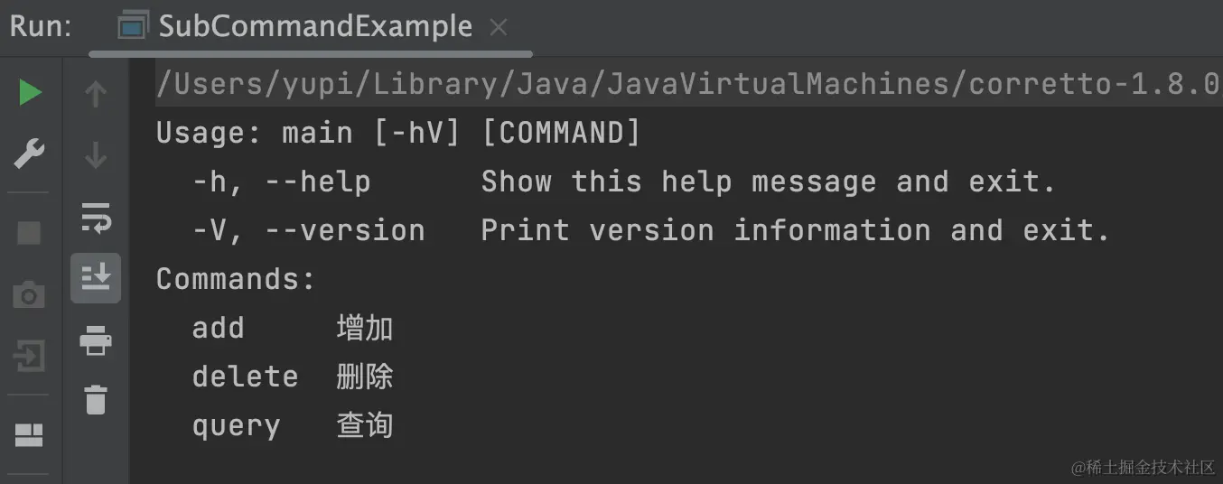 让我们编写一个示例程序,支持增加、删除、查询 3 个子命令,并传入不同的 args 来测试效果。