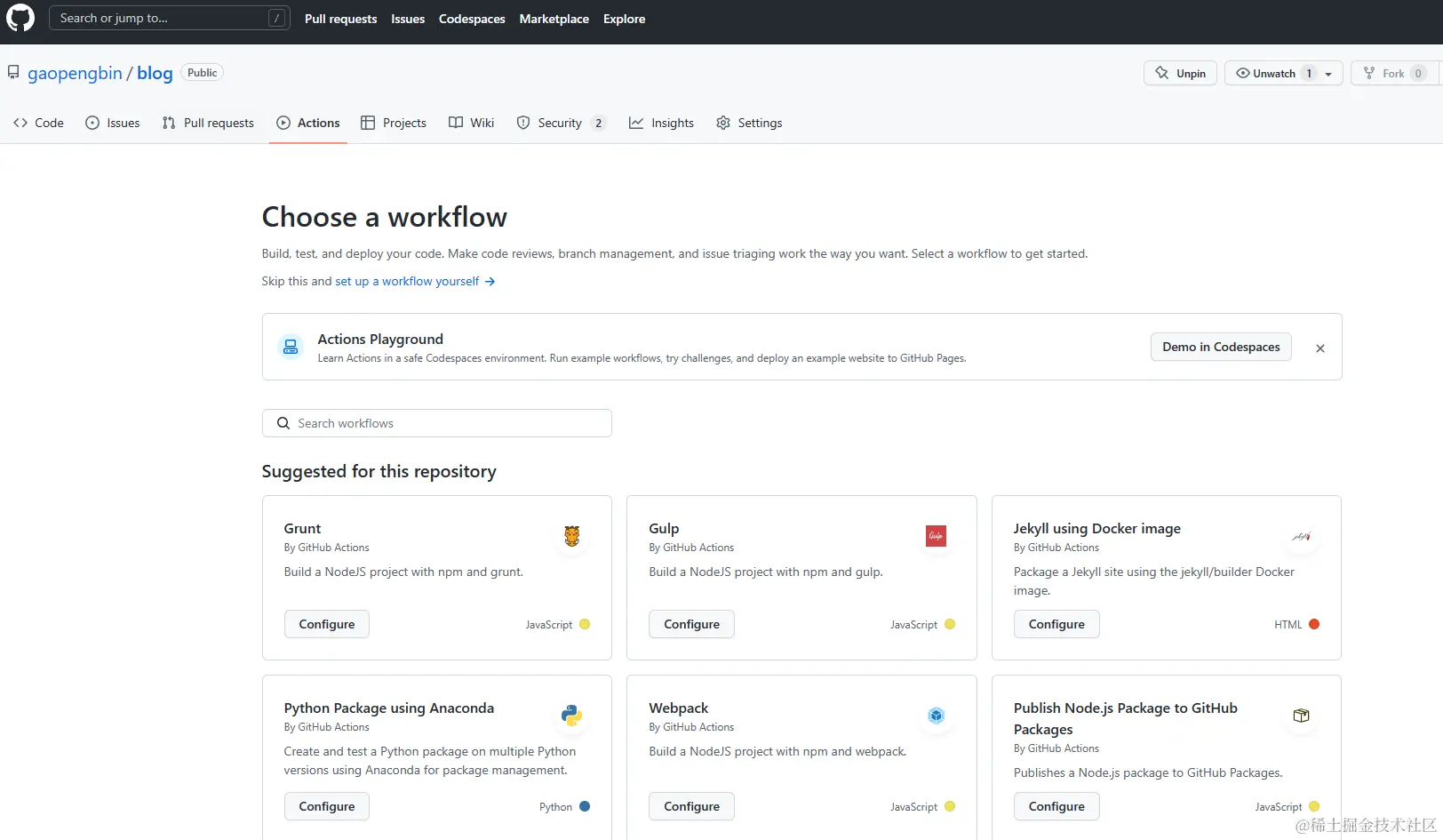 就是告诉github在你的项目提交更新后,它要做些什么,这里有很多模板,我就想要一个能打包部署的。