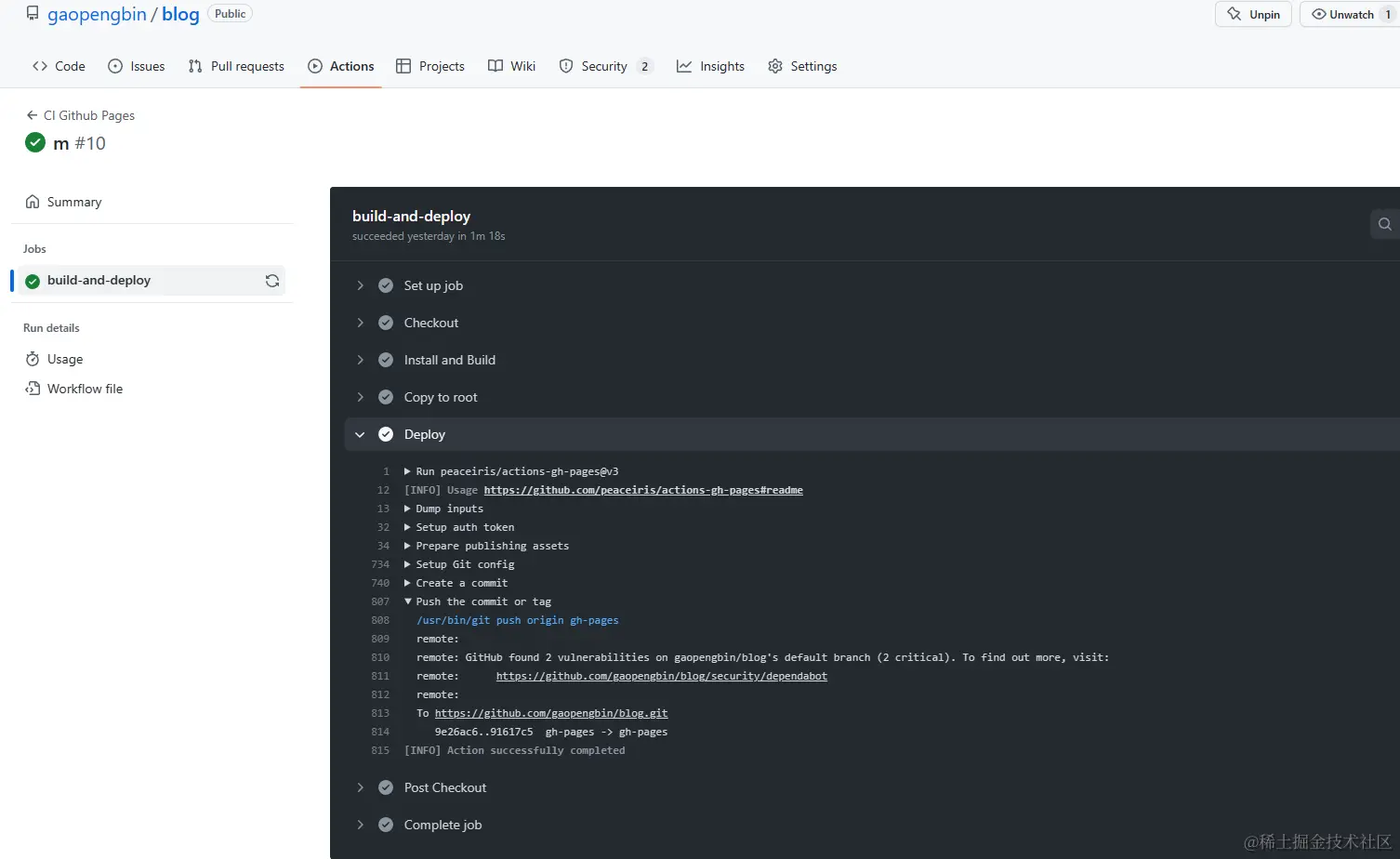 在本地push之后,就可以看到actions在执行了,包括每一步的执行情况,如果没有错误,执行成功后就是绿色的对钩,再去访问一下部署的页面就可以看到更新后的网页了。