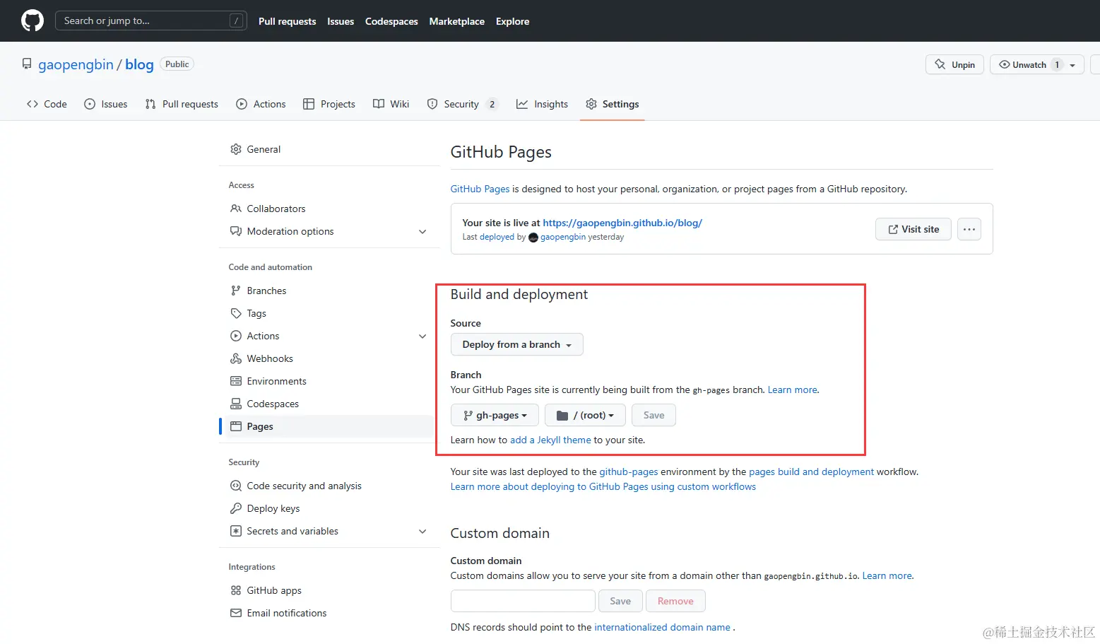 把这里配置一下就可以了,刷新页面就会显示你的pages访问地址,这个gh-pages分支是在执行上面的workflow的最后一个步骤时创建并推送的,至此,就可以访问到部署的项目了。