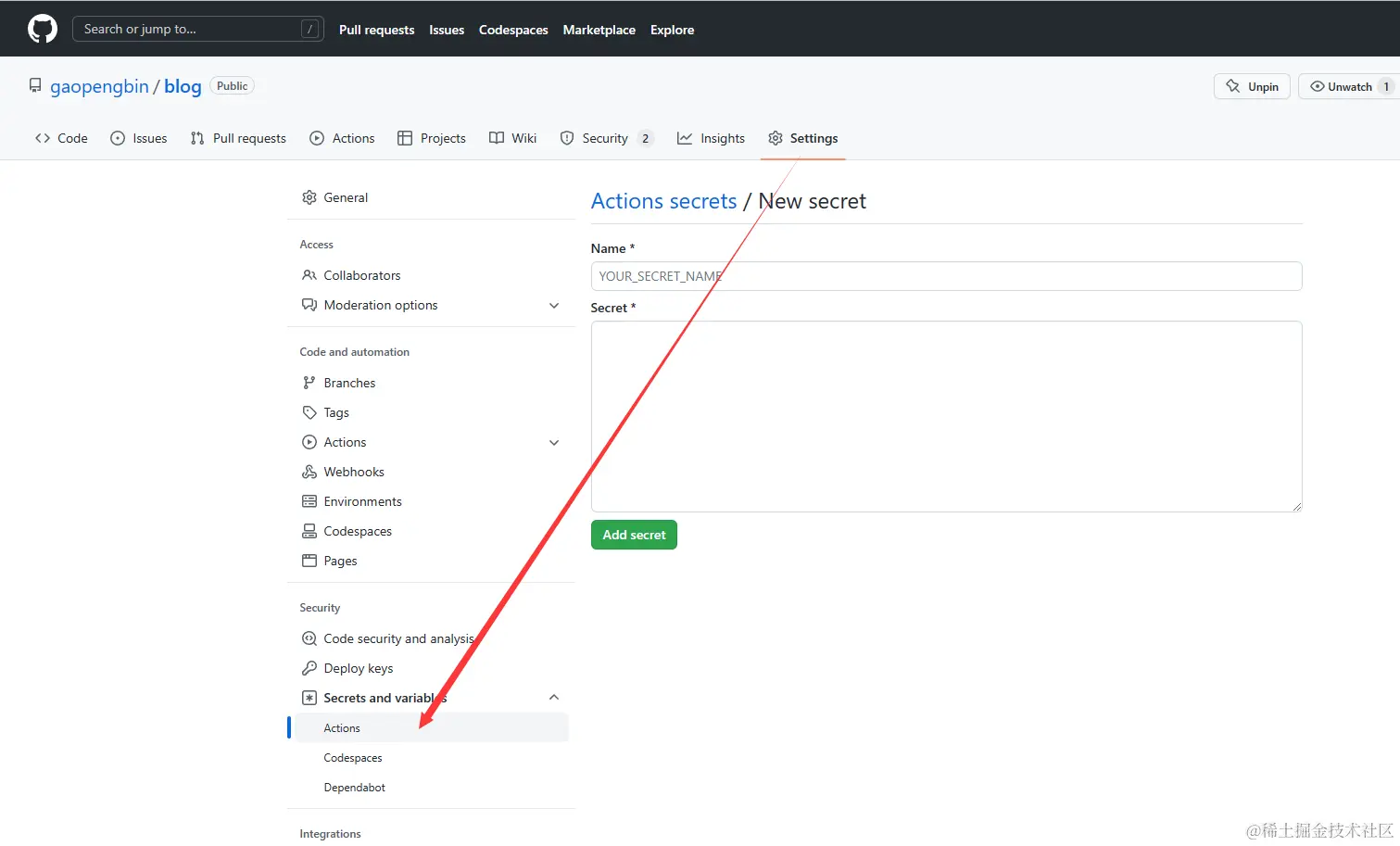 再回到项目的Setting中,把刚创建的token放进来,这里的Name和yml配置中github_token里面对应的。