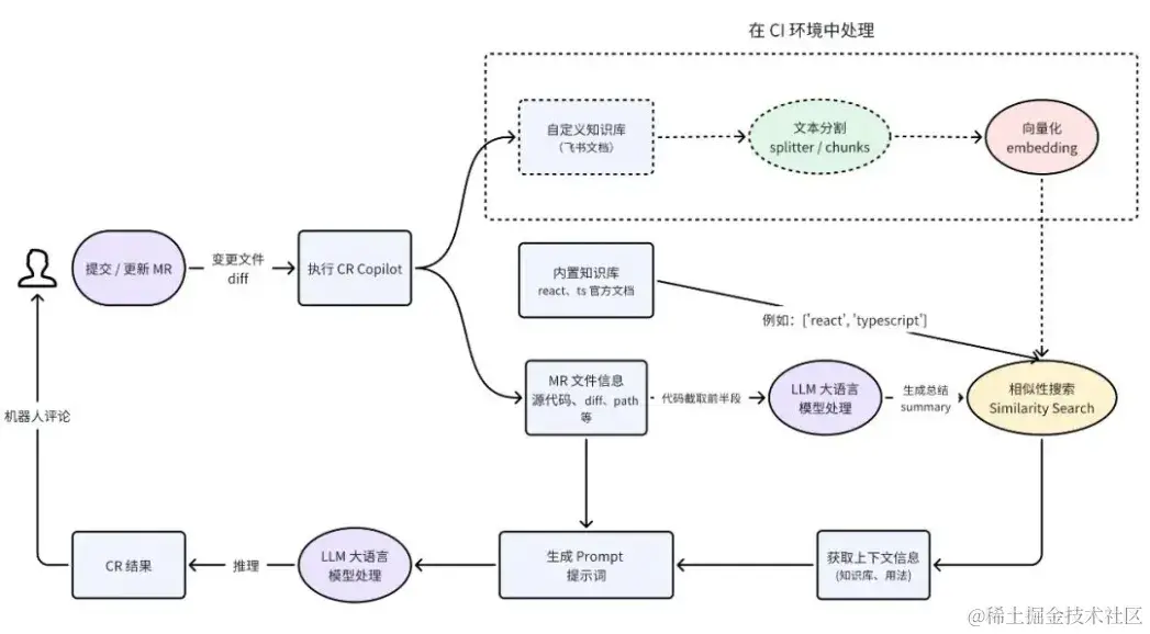 今年 10 月 11 日,字节前端 ByteFE 团队发布了一篇基于大模型 + 知识库的 CodeReview 实践的文章。该文章提出,预先搭建一个包含公司内部基础框架、业务专用系统和业务专业术语等领域知识的矢量知识库,将大模型生成的 代码 summary 在矢量数据库中匹配获取相关知识,最后再与被审查的代码生成最终的 prompt 并提交给大模型处理。通过这种方式可以解决以往大模型 CodeReview 因缺乏对提交代码领域知识的理解而无法发现和识别业务逻辑中有意义的错误、CR 建议不尽如人意等问题。