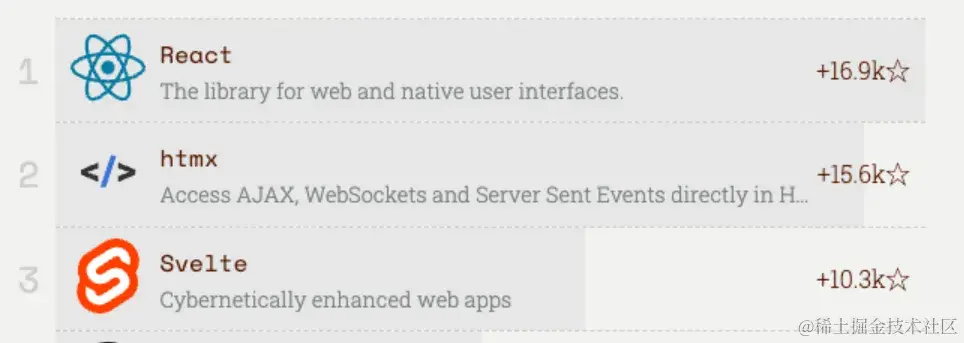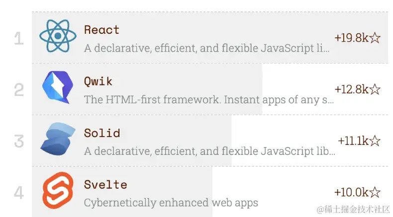 - 在前端框架领域,前端框架的四家马车 React、Vue、Svelte 和 Angular 继续领跑,它们都在按照自己的特色不断发展与进步。此外 Qwik 和 Htmx 在今年也广受前端社区喜爱,成为年度前端框架的黑马。