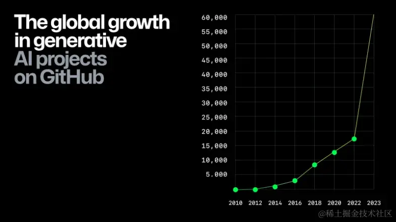 自 2022 年底 OpenAI 发布 ChatGPT 后,因为其卓越的对话能力和广泛的应用潜力,引起了世界范围内广泛关注和热烈讨论,也迅速掀起了一场人工智能变革浪潮。从 Github 2023 年度报告显示,2023 年 Github 上 AIGC 相关项目的数量呈现出爆发式增长,这得益于今年大模型的迅猛发展与其泛化能力。