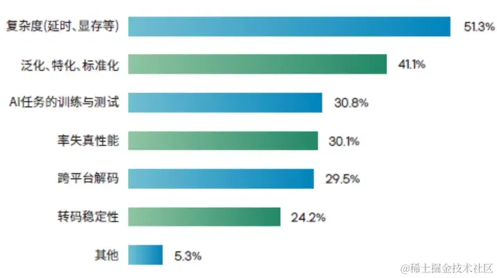 此外,随着今年大模型的迅猛发展,AI 编解码受到越来越多的关注。AI 编解码打破传统框架,采用机器学习的方式,相较于传统方案可以获得压缩率的大幅度提升,目前 AI Codec 的 SOTA 方案的压缩性能上已经超越了 H.266/VVC,展现了其非常强大的技术潜力,但是由于其在按乘加数计的运算复杂度也有较大增,从压缩率与复杂度折中的角度看,并没有达到惊艳的效果,以及非标准的原因,目前还不足以打破现有生态获得大规模推广。从《2024 音视频技术发展报告》中显示,复杂度包括延时、计算量、显存等问题是AI 编解码目前存在最大挑战,其次是泛化、特化、标准化等问题。