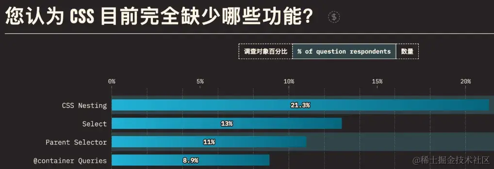 CSS 支持嵌套一直是 Sass 中最受开发者喜爱的功能点之一,它允许让开发者在编写样式的时候更加整洁、内聚。据上一年 State of CSS 统计,CSS 嵌套是受访者认为 CSS 最需要补充的功能之一。