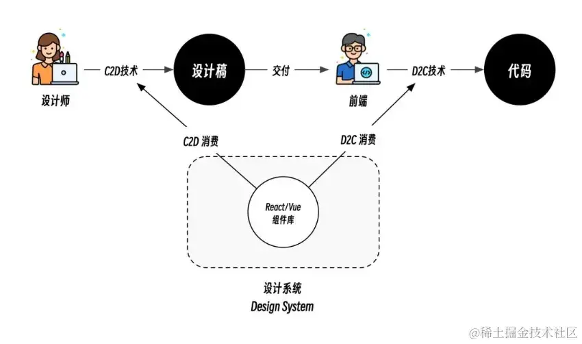 传统 D2C 如果想要做到精准识别组件,利用图像识别和深度学习难以实现,一般都需要设计稿足够规范或包含足够多的标注信息,而 C2D2C 就是为了解决传统 D2C 在组件识别上的局限性。所谓 C2D2C,就是开发同学先用现有 UI 组件库转换成设计组件并导入到设计平台作为物料,然后设计同学使用这些设计组件物料输出设计稿,最后设计稿再转成基于 UI 组件库的代码。由于设计稿和代码使用的是同一套设计系统,设计稿中的组件和最终代码中的组件是一一映射的关系,因此无需进行标注就可以实现组件的精准识别。字节的 Semi D2C、腾讯的如意助手、网易的海豹助手都是在 2023 年发布的 C2D2C 的具体产品。