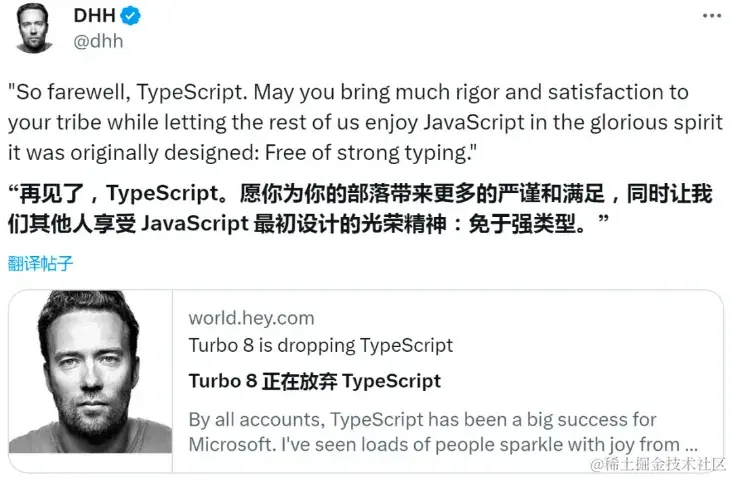 尽管目前 TypeScript 如日中天,取得了前所未有的成功。然而,在今年 8 月份,Ruby on Rails 的创建者 David Heinemeier Hansson(DHH) 从即将发布的 Turbo 框架第 8 版中删除了 TypeScript,并发文称 “通过添加微不足道的类型技巧,让我的开发体验变得更加糟糕,而且频繁引发很多困扰。本应简单的事情反而变得很困难。”