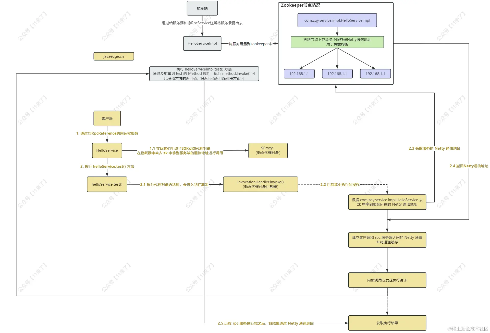 注册中心:RPC 框架是需要服务之间进行调用,那么一定要有一个地方去存储服务的地址,可以进行服务注册和服务发现的功能的,注册中心使用 ZooKeeper 实现动态代理:RPC 框架中,服务消费者肯定是没有服务提供者的一个实例对象的,因为他们分布在不同机器上,所以需要去创建动态代理对象负载均衡:这个是在消费方实现的,消费者从注册中心拉取到服务提供者的地址,可以根据多个地址进行负载均衡序列化、网络通信:消费者最终会将调用请求发送到服务提供者去,最终服务提供者执行完本地方法,再将执行结果给返回,这其中通信框架可以使用 Netty(高性能网络通信),并且需要将调用请求序列化为二进制的字节数组,才可以通过网络发送出去