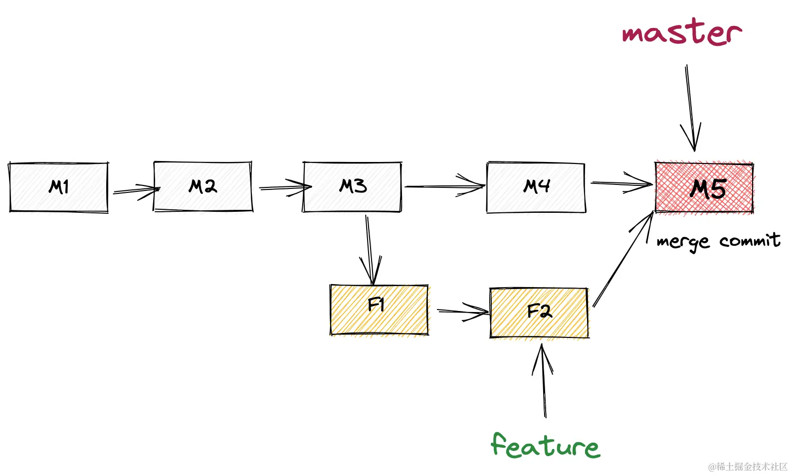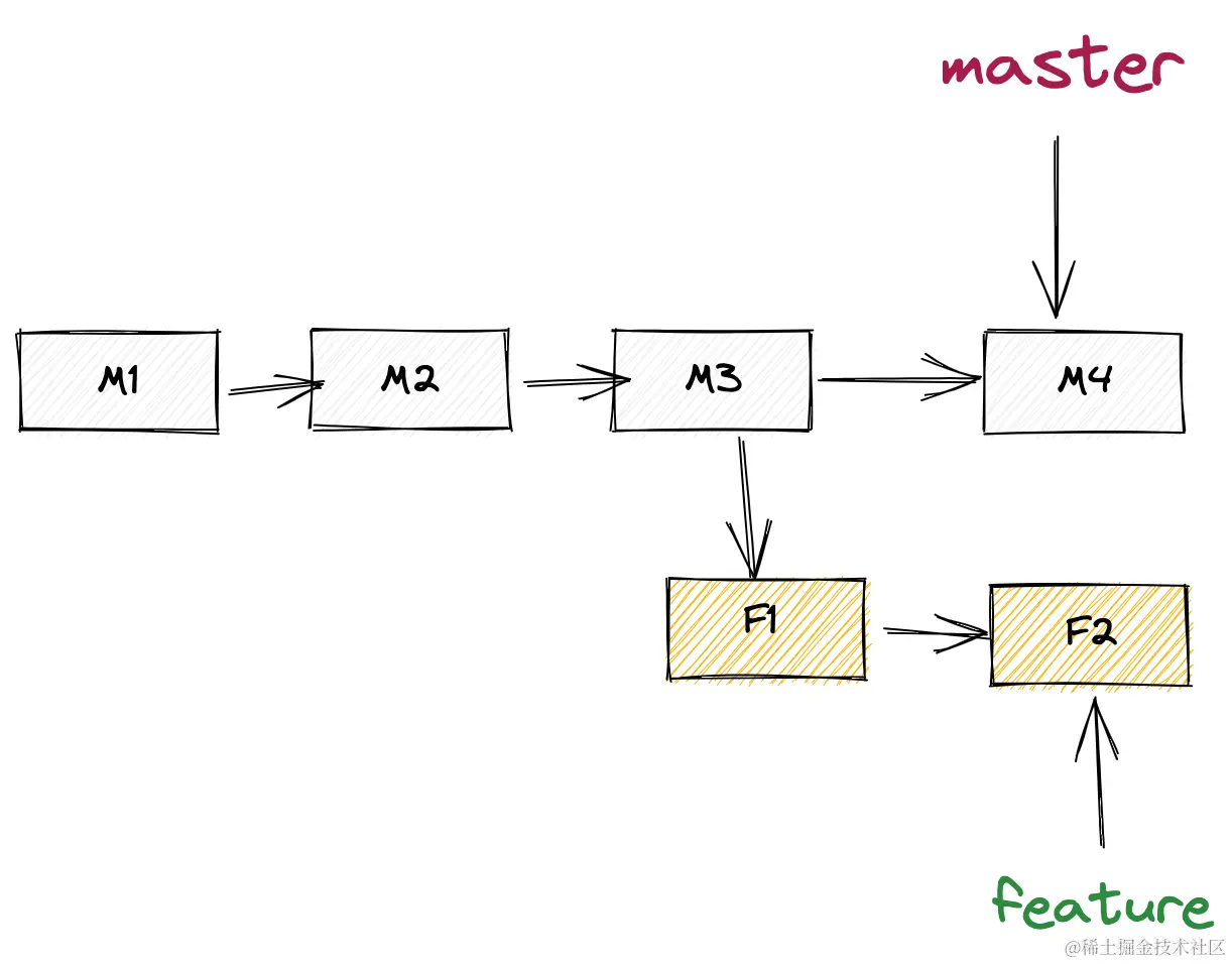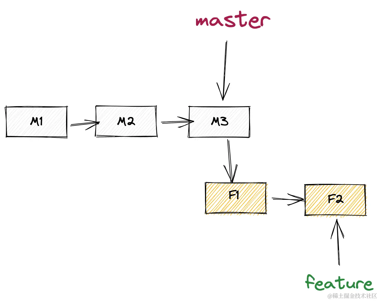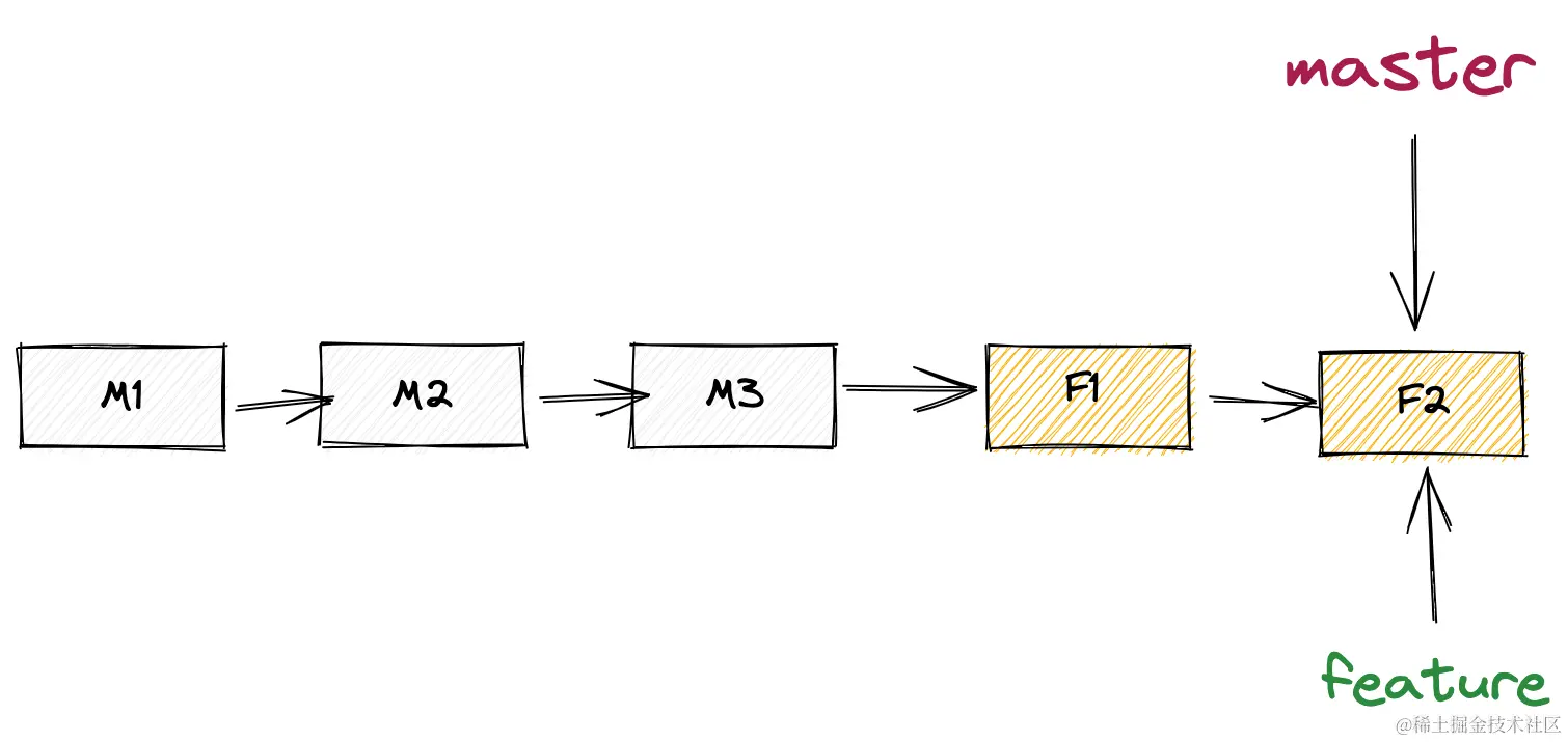 当前分支master和目标分支feature没有分叉。则可以直接进行fast forward合并。