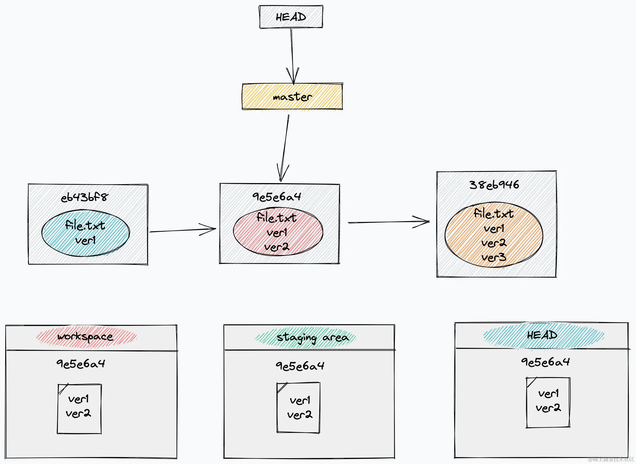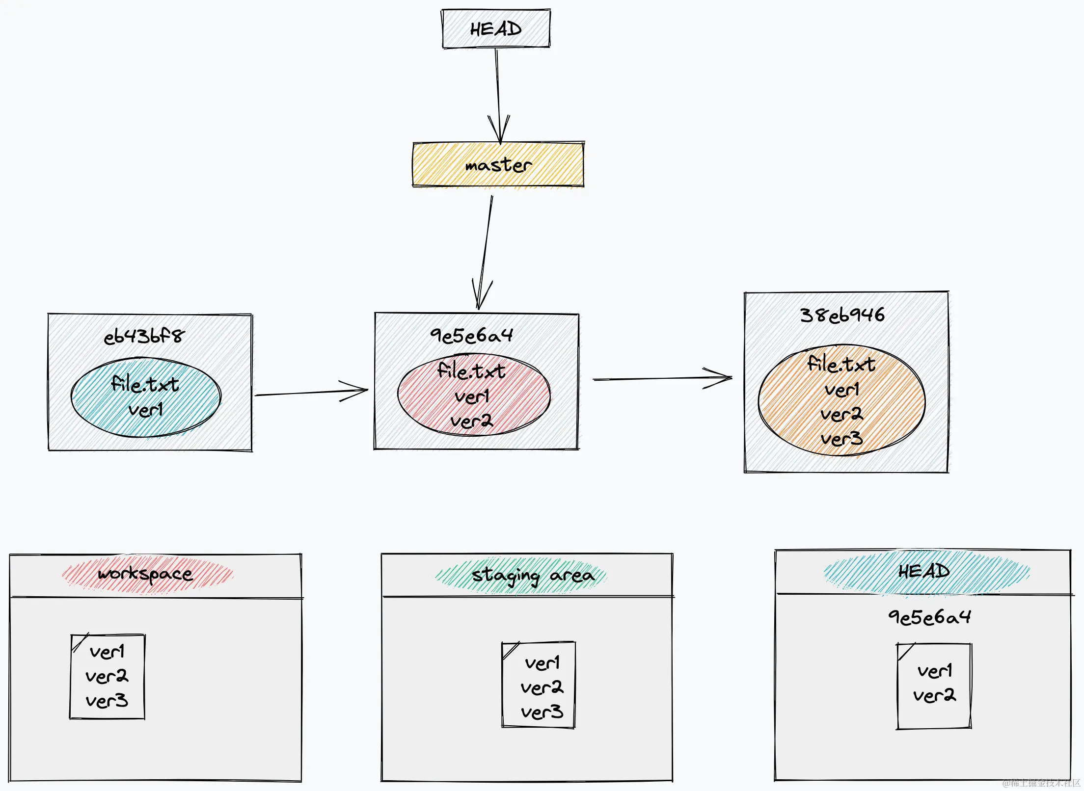 HEAD 指针移动,同时暂存区也会被回滚到ver2