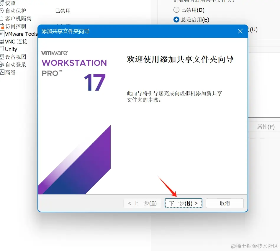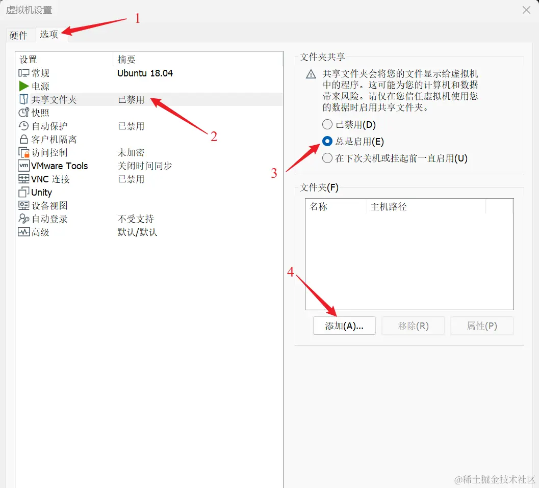 - 启动虚拟机软件,打开虚拟机设置-->选项,勾选总是启用共享文件夹,点击添加: