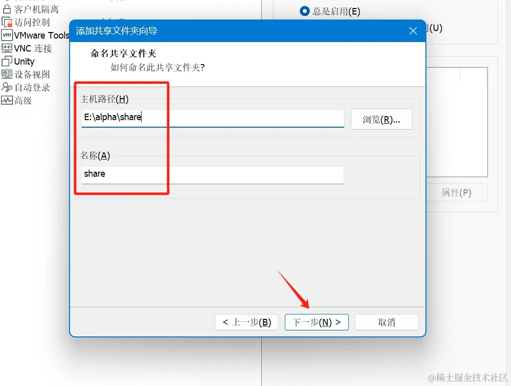 - 填写主机共享文件夹路径和名称,点击下一步: