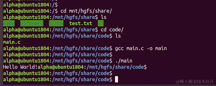 - 启动虚拟机系统,打开终端,进入共享目录/mnt/hgfs,可以看到共享文件夹 share: