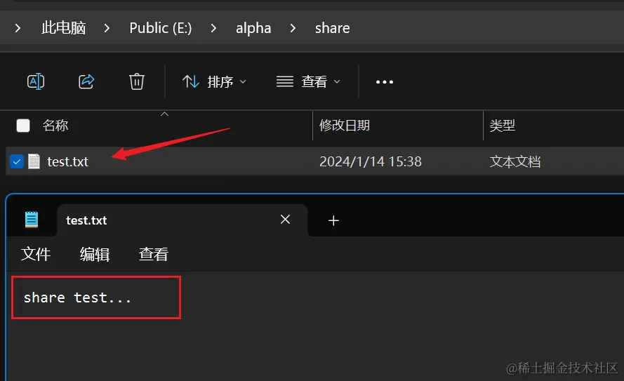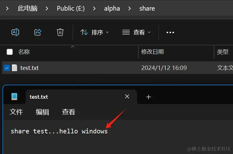 - 在主机共享目录中创建一个共享测试文件,随机输入一些内容: