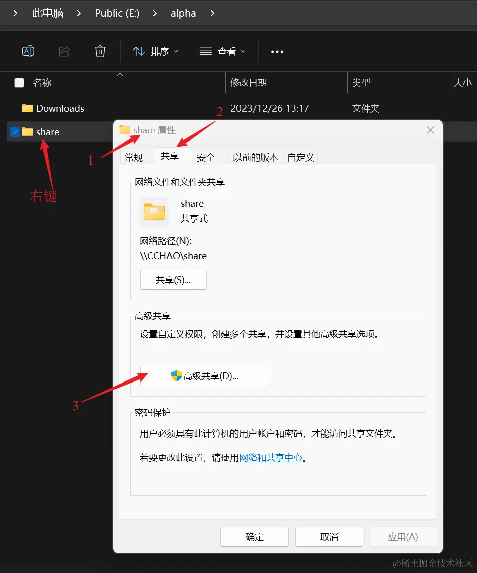 - 右键点击共享文件夹,打开属性-->共享-->高级共享: