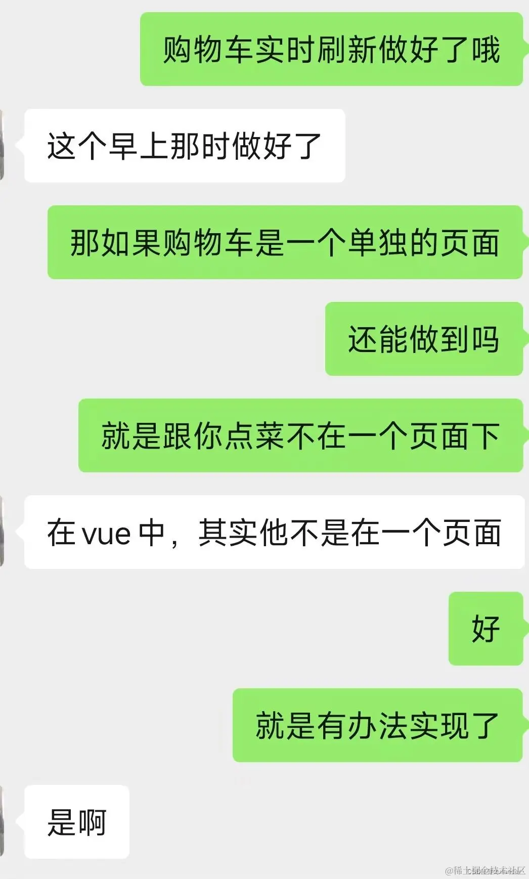 这里,前端组员的意思其实是,即使在购物车在点菜的页面中,其实在 Vue里,他也不是一个页面,可以通过vue的组件传参实现。这两个本就是不同组件,不同的 .vue文件,但其实需求是 两个不同的网页。