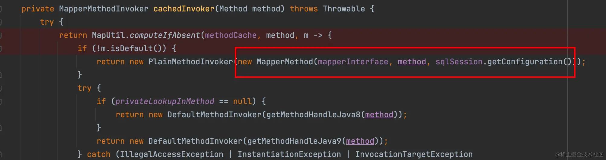 代理类执行方法的时候,在invoker的方法中,调用cachedInvoker.invoke(),而cachedInvoker的时候,会传入当前方法method,当前Mapper接口,以及sqlSession中的configuration(全局配置) 生成一个MapperMethod 对象。这个对象里面有两个字段需要关注,command和method方法签名