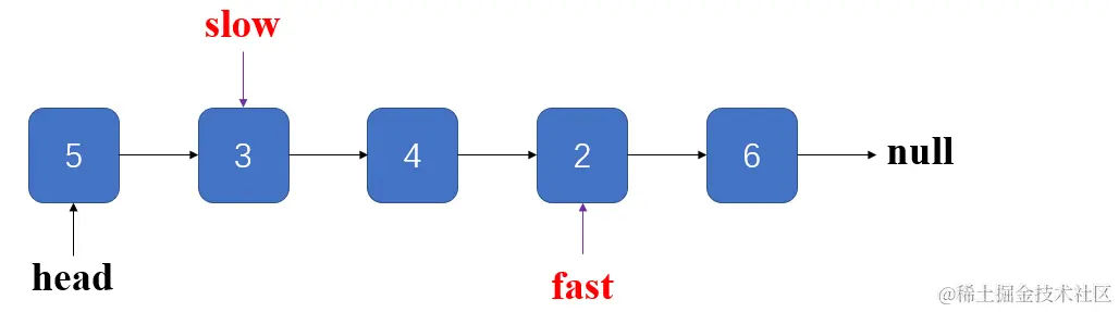 当结点的个数超过 3 个时,快慢指针初始设置为:slow = head; fast = head.next.next;