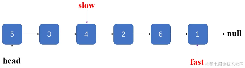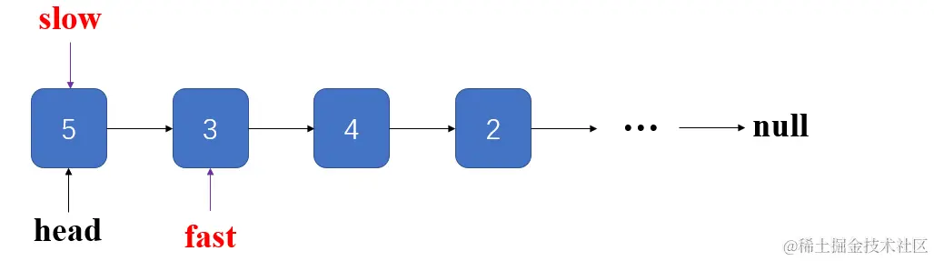 当结点的个数超过 3 个时,快慢指针初始设置为:slow = head.next; fast = head.next.next;