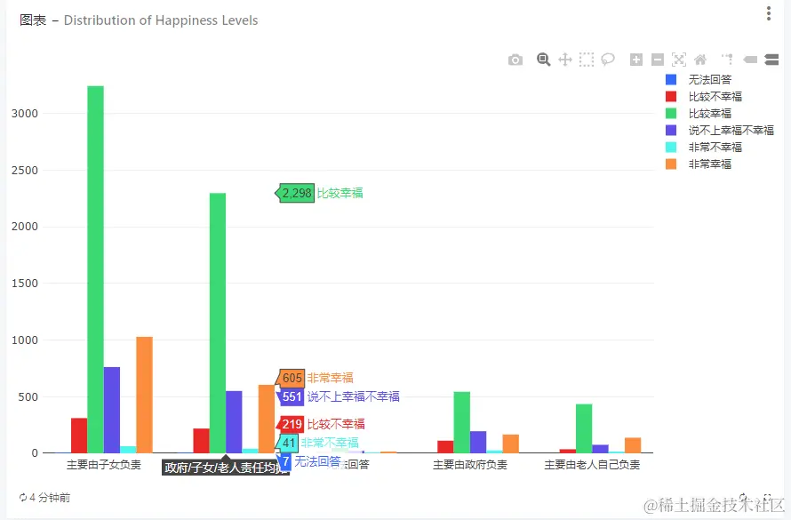 根据柱状图我们可以一目了然,老年人还是对子女负责赡养责任幸福感会提升。
