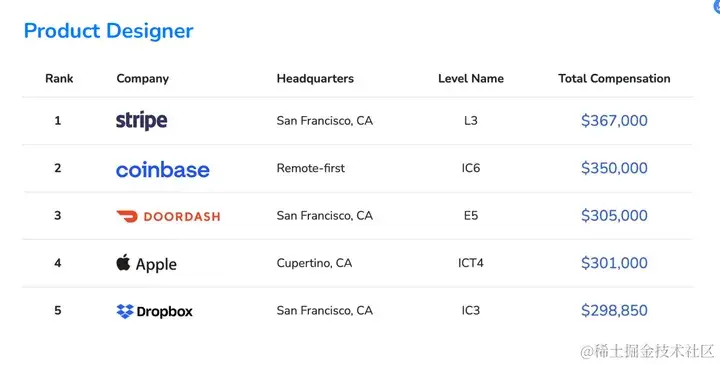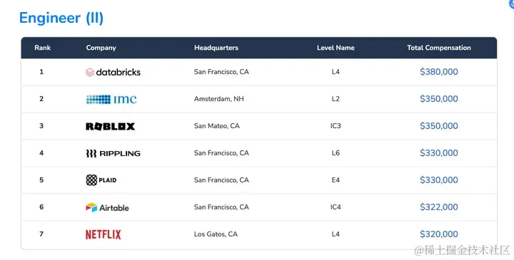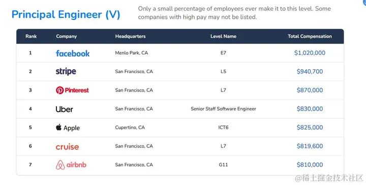 由于不同公司的薪酬职级情况不同,不同level的程序员的工资也各不相同。levels.fyi将程序员分为五级,分别是Entry-level(0~2年)、Engineer(2-5年)、Senior Engineer(5年+)、Staff Engineer(10年+)、Principal Engineer(15年+),可初步对应为初级工程师、高级工程师、主管工程师、首席工程师。