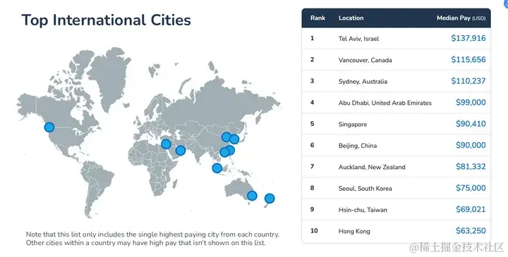 接下来就是我们最关心的程序员的薪资问题,毋庸置疑还是美国登顶,中位薪资达到了137K,加拿大以115K紧随其后,中国北京也以90K的薪资上榜,位列第六,还是不错的成绩。