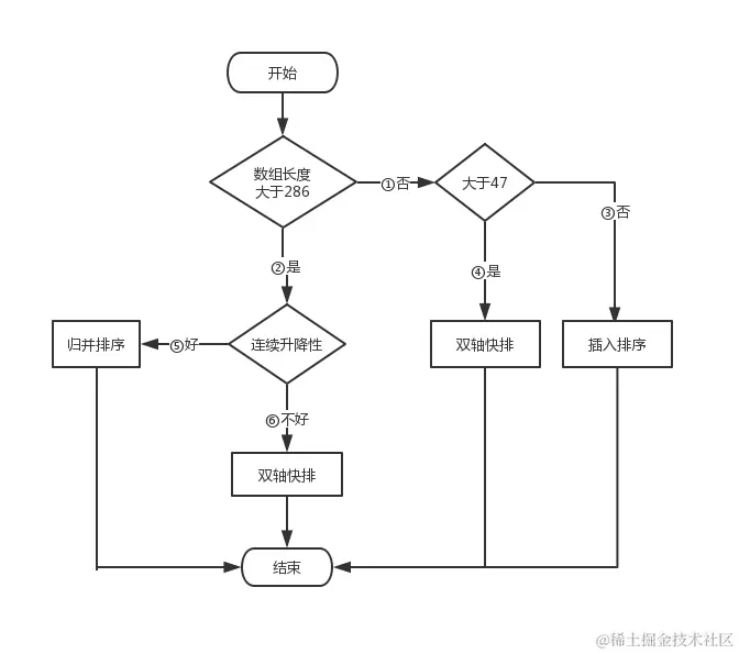 if (length < INSERTION_SORT_THRESHOLD) { // ③小于47使用插入排序,否则使用快排